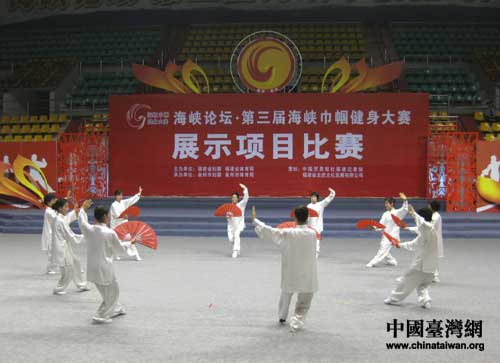 海峽論壇·第三屆海峽巾幗健身大賽展示項目決賽今天晚上7點在泉州僑鄉體育館舉行。圖為澳門隊表演《太極回歸扇》(中國臺灣網發 蘭伯樂 攝)