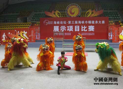 海峽論壇·第三屆海峽巾幗健身大賽展示項目決賽今天晚上7點在泉州僑鄉體育館舉行。圖為泉州隊表演舞獅《金獅獻瑞迎新潮》(中國臺灣網發 蘭伯樂 攝)