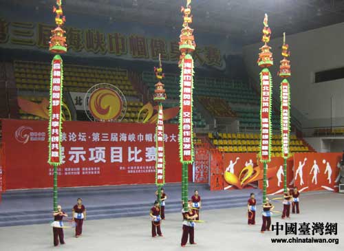 海峽論壇·第三屆海峽巾幗健身大賽展示項目決賽今天晚上7點在泉州僑鄉體育館舉行。圖為南平隊表演《建甌女子挑幡》(中國臺灣網發 蘭伯樂 攝)