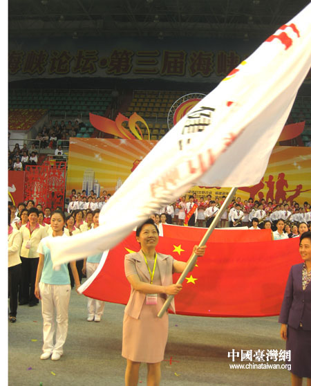 海峽巾幗健身大賽會(huì)旗交接儀式,下一屆舉辦城市龍巖接過(guò)會(huì)旗。中國(guó)臺(tái)灣網(wǎng)特約記者 蘭伯樂(lè) 攝