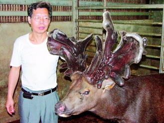 飼主游忠川說,現年8歲的“三角二世”,如果要換算人的年紀約30歲,它的鹿茸產值能抵3頭鹿。曾有人開價800萬元請他割愛,但他舍不得。(雨暄)