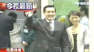 6月29日晚,馬英九妻子周美青二度陪丈夫“出訪”,依然成為媒體焦點(diǎn)。(圖片來(lái)源:臺(tái)灣TVBS電視臺(tái))