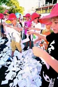 臺灣家長團(tuán)體昨天在臺北市發(fā)起“我要免試的12年義務(wù)教育”大游行,許多小朋友跟著爸媽上街頭,一起撕“準(zhǔn)考證”。(來源:臺灣《聯(lián)合報(bào)》)