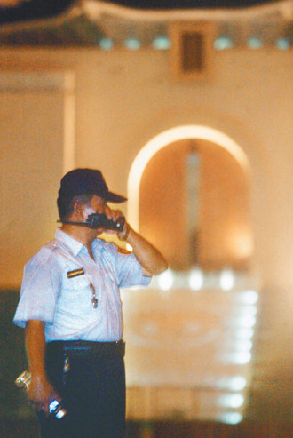 臺北中正紀念堂管理處今天將拆除“灣民主紀念館”匾,為防止意外發生,警察昨天入夜后即站崗待命,并凈空自由廣場內的民眾。(圖片來源:臺灣《聯合報》)