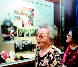 “慰安婦”阿嬤吳秀妹(左)與盧滿妹(右)今天上午出席“月光——‘慰安婦’生命故事影像展”揭幕記者會,并共同參觀攝影展。圖片來源:臺灣《聯(lián)合晚報》