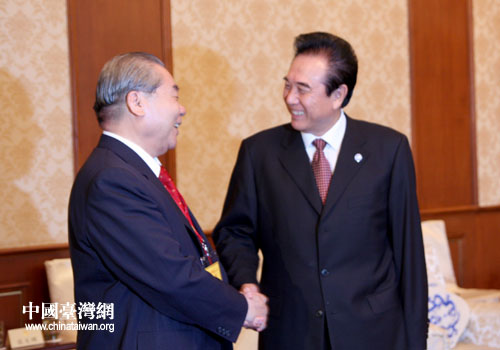 全國政協常委、全國政協港澳臺僑委員會主任、海峽兩岸關系協會會長陳云林(右)會見臺灣各界知名人士訪京團。(中國臺灣網 張弛 攝)