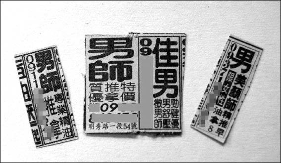 臺中警方透露,臺灣男人應(yīng)召案例并不多見,且該類男妓不但接女客,有時也接男同性戀的客人,性關(guān)系復(fù)雜,容易感染性病,在“人肉市場”中屬高危險群,提醒尋芳客注意。(羅煜明)