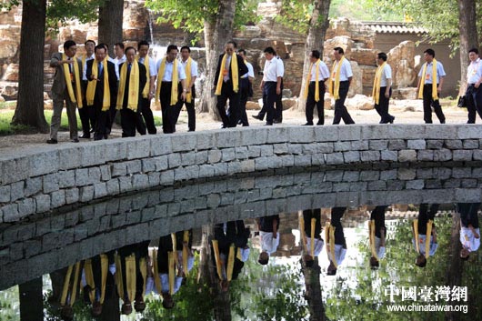 8月8日上午,“冀臺同胞共祭三祖大典”在張家口市涿鹿縣中華三祖堂廣場舉行,共祭黃帝、炎帝、蚩尤。圖為海峽兩岸關系協會副會長王在希與新黨主席郁慕明參觀清澈非常的黃帝泉。(中國臺灣網 鐘寶華 攝)