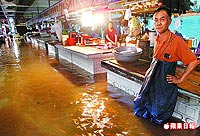 高雄縣梓官鄉淹水,市場攤販仍硬著頭皮擺攤,表情無奈。來源:臺灣《蘋果日報》