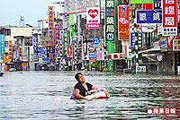 鬧街汪洋。“莫拉克”臺風(fēng)重創(chuàng)南臺灣,屏東縣林邊鄉(xiāng)一名婦人昨冒險涉水搬運(yùn)物資,好讓一家老小果腹。來源:臺灣《蘋果日報》