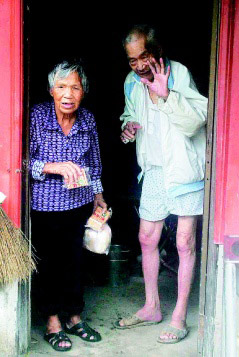 進入小林村,一對老夫婦不斷表達感謝救援人員帶去的救援物資,表示說他們已經(jīng)好久沒見到人了。(圖片來源:臺灣《聯(lián)合報》)