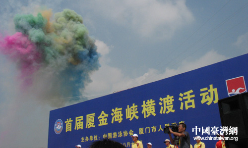 橫渡活動開幕式今天上午10點舉行,中共廈門市委書記于偉國、廈門市市長劉賜貴,以及金門縣長李炷峰等兩岸有關人士出席。開幕式后,泳將們在人群的歡呼聲中,興奮地跑向大海,還不時回頭向岸上的人們揮手致意,并露出歡快而自信的笑容。這100名泳將是兩岸經過嚴格測試后選出的,最終入選者包括來自福建、北京、廣東、黑龍江、重慶、天津等地的36名男選手和13名女選手,最大61歲,最小16歲。我國著名橫渡健將、現年45歲的北京體育大學戶外運動中心主任張健也參加了本次活動。張健曾經成功橫渡瓊州海峽、英吉利海峽、渤海灣、伶仃洋、青海湖等,是中國大陸橫渡英吉利海峽的第一人。這50位大陸選手和臺灣選出的50名泳將一起,實現了60年來兩岸民眾橫渡廈金海峽的夢想。