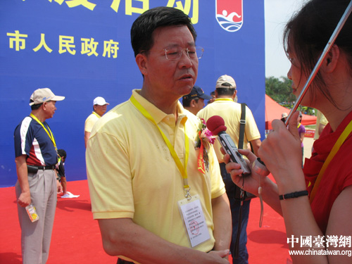 8月15日,兩岸首屆廈金海峽橫渡活動在廈門舉辦,兩岸100名泳牽手下海,共同完成此次壯舉。圖為金門縣長李炷峰接受媒體采訪。(攝影:徐麗麟)