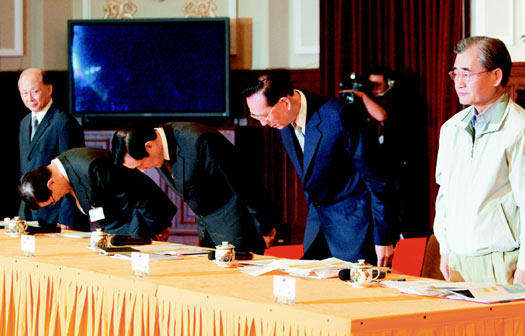 馬英九(右三)昨天率臺當局“首長”在記者會上道歉。他與蕭萬長(左二)、“行政院副院長”邱正雄(右二)鞠躬后定住7秒鐘,一時不察的“國防部長”陳肇敏(左一)、“交通部長”毛治國(右一)卻已先起身。圖片來源:臺灣《聯(lián)合報》