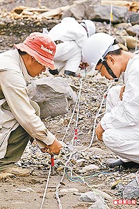清云科大助理教授游峻一(左)以地電阻測(cè)勘儀協(xié)助開(kāi)挖。來(lái)源:臺(tái)灣《蘋果日?qǐng)?bào)》