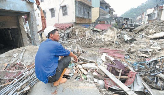 高雄縣那瑪夏鄉民族村在“莫拉克”風災中受創嚴重,一名村民看著被洪水與泥石流沖壞的房子,滿目凄涼。圖片來源:臺灣《聯合報》