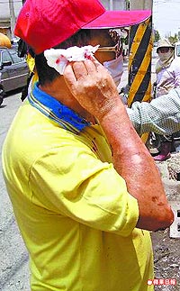 受害民眾施松井被屏東縣議員盧同協砸傷后,被村民拉到一旁。來源:臺灣《蘋果日報》