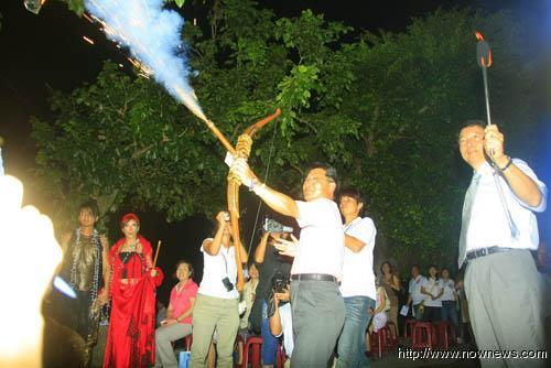 宜蘭縣長呂國華拉弓點亮情人節星光鵲橋。圖片來源:臺灣“今日新聞”