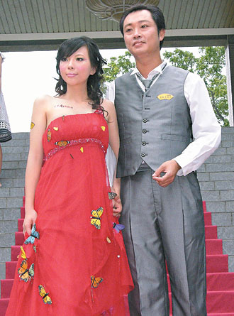 準新娘陳韻如(左)紅禮服上停滿蝴蝶,準新郎顏志達挽著她趕緊拍照,因為10分鐘后禮服上的蝴蝶就要飛走了。來源:臺灣《聯合報》