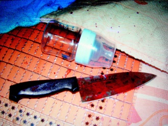 簡姓婦人殺死4個月大兒子的兇刀,血跡斑斑,兇刀旁還留有兒子用的奶瓶。圖片來源:臺灣《聯(lián)合報(bào)》