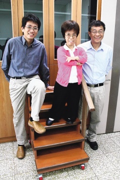 臺(tái)灣“中央大學(xué)”網(wǎng)絡(luò)學(xué)習(xí)科技研究所教授陳攸華(中),因身高“迷你”,校方為她特制小樓梯上課,左右兩人分別為力邀她回臺(tái)灣的副教授劉晨鐘和教授陳德懷。來源:臺(tái)灣《聯(lián)合報(bào)》