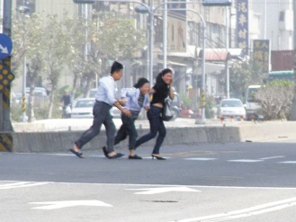 臺中縣海線地區(qū)昨天東北季風(fēng)強勁,行人相互攙扶過馬路,以免被吹倒。來源:臺灣《聯(lián)合報》