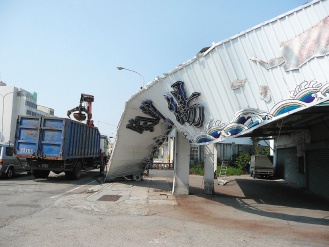 梧棲鎮(zhèn)中棲路一家歇業(yè)的釣蝦場招牌,昨天中午也被強風(fēng)吹落,整片長達20多米,所幸沒有人傷亡,業(yè)者趕緊請來工人以乙炔切開,再以大貨車運走。