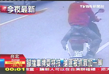臺一劫犯搶劫后用腳擋車牌避查緝 當街耍特技(圖)