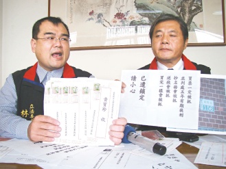 國民黨政策會(huì)執(zhí)行長林益世(左)拿出收到的“賄選已遭鎖定”信件,指控這是選舉奧步。 來源:臺(tái)灣《聯(lián)合報(bào)》