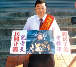 競選新竹縣長的曾錦祥,昨天在竹東公辦政見會場向民眾下跪,說要扮演包公斬妖除魔。 來源:臺灣《中國時報》