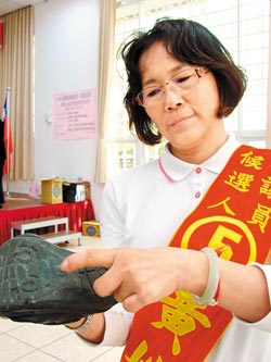 黃婉如脫下鞋子,秀出破掉的鞋底,表示選戰(zhàn)激烈,讓她一刻不得閑。 來源:臺灣《中國時報》