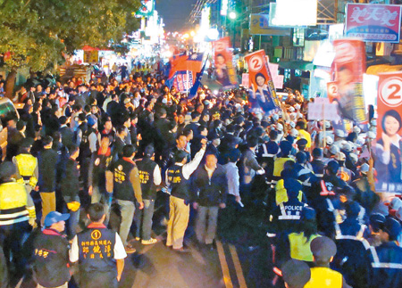 中國臺灣網12月1日消息 據臺灣《中國時報》報道,馬英九、謝長廷昨晚在新竹縣各自幫候選人站臺,造勢地點相隔約僅300米。鑒于1個禮拜前雙方人馬曾在新竹掃街狹路相逢爆發肢體沖突,外界擔心擦槍走火,所幸警方隔開雙方未起沖突。
