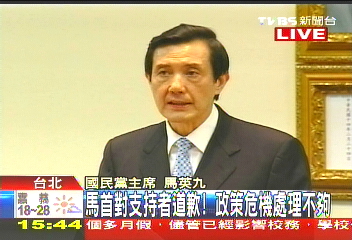 國民黨中常會檢討“三合一”選舉,黨主席馬英九兩度致歉。來源:臺灣TVBS電視臺
