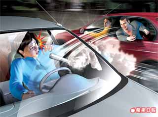 飆車族駕車逆向沖過來,朝正在等紅燈的鄭姓駕駛車內(nèi)丟信號彈,瞬間車內(nèi)就布滿煙霧。 來源:臺灣《蘋果日報》