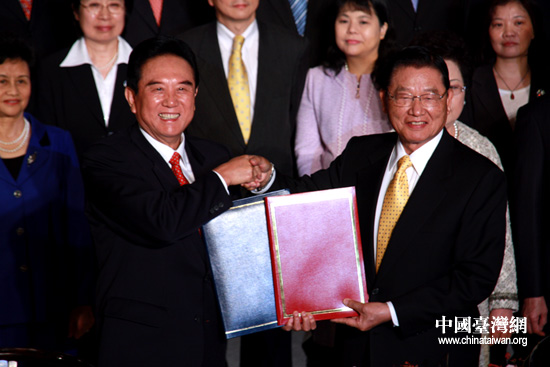 中國臺灣網12月22日臺中消息 22日下午,海協會會長陳云林與臺灣海基會董事長江丙坤在臺中市簽署《海峽兩岸漁船船員勞務合作協議》、《海峽兩岸農產品檢驗檢疫合作協議》、《海峽兩岸標準計量檢驗認證合作協議》等三項協議。圖為陳云林與江丙坤交換協議文本。(中國臺灣網 李徽 攝)