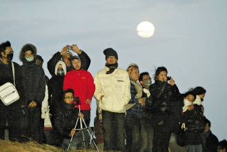 2010年第一天,屏東墾丁龍盤公園聚集上萬(wàn)民眾前來(lái)迎接第一道曙光,大家冒著寒風(fēng)殷殷期待,與背后的月亮形成有趣對(duì)比。來(lái)源:臺(tái)灣《聯(lián)合晚報(bào)》