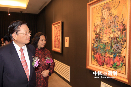 海基會董事長江丙坤在大陸著名油畫家劉令華陪同下參觀國粹油畫精品展。2010中國國粹油畫藝術精品展30日上午在臺北市孫中山紀念館開幕。 (中國臺灣網 田云鵬 攝)