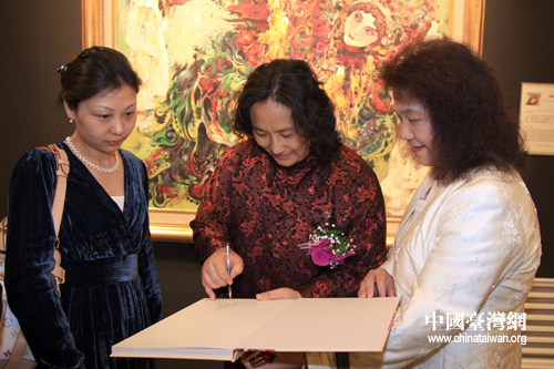 2010中國國粹油畫藝術精品展1月30日上午在臺北市孫中山紀念館開幕。畫家劉令華在代表作《貴妃醉酒》前為觀展民眾簽名留念。 (中國臺灣網 田云鵬 攝)