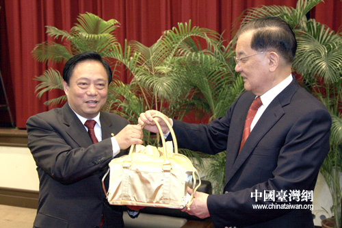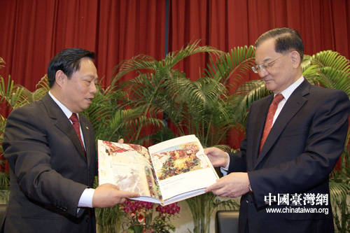連戰向梁國揚贈送臺灣特產茶葉。(中國臺灣網 田云鵬 攝)