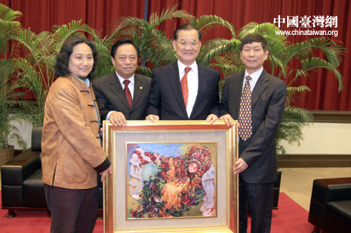 梁國揚向連戰贈送國粹油畫精品《貴妃醉酒》的繡品。(中國臺灣網 田云鵬 攝)