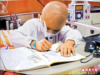 豆豆愛讀書,住院化療期間,學(xué)校老師也會(huì)到病床前教他功課。來源:臺(tái)灣《蘋果日?qǐng)?bào)》