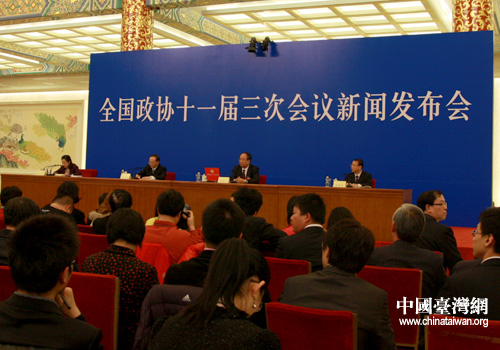 今天下午三點,全國政協(xié)十一屆三次會議在人民大會堂金色大廳召開首場新聞發(fā)布會。(中國臺灣網(wǎng) 高斯斯 攝)