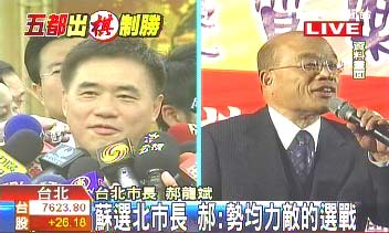 中國臺灣網3月3日消息 據臺灣TVBS電視臺報道,蘇貞昌將宣布參選臺北市長,而競爭對手、爭取連任的郝龍斌,認為雖然民調起起伏伏,但這是一場勢均力敵的選戰。