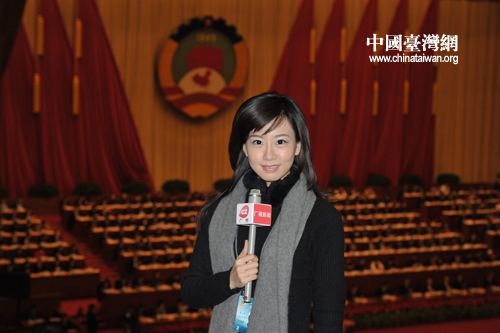 廣州電視臺的美女主播在人民大會堂現場播報。 (中國臺灣網發 肖春陽、劉洋)