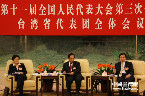 中國臺灣網(wǎng)3月13日北京消息 十一屆全國人大三次會議臺灣代表團(tuán)開放日于12日在人民大會堂臺灣廳舉行。臺籍代表們就海峽西岸經(jīng)濟(jì)區(qū)、臺生就業(yè)、兩岸司法協(xié)作等方面進(jìn)行討論,并回答中外記者提問。臺籍代表陳蔚文表示,預(yù)計(jì)至建議提交截止時間,臺灣團(tuán)將提交60余份議案和建議。