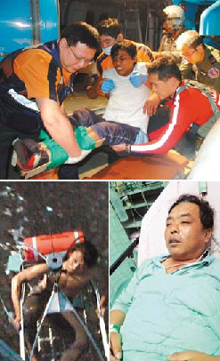 目前,受傷的“正升豐號”船長蔡清隆和兩名印度尼西亞漁工,在被臺灣搜救中心的直升機救起后,已經由救護車送往醫院救治。據了解,船長的弟弟即輪機長蔡保明和另外兩名印度尼西亞漁工仍下落不明。蔡清隆說,失蹤的3人身上都攜帶有信號彈,若搜救直升機和艦艇靠近,3人應該會立即點燃信號彈,現在距離失事不過才10幾個小時,3人生存機率的還很大。