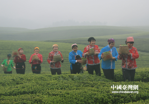 漫山遍野的茶樹翠色欲滴,美麗的采茶姑娘穿梭于茶樹之間,纖手拈芽,不亦樂乎。(中國臺灣網(wǎng) 李丹 攝)