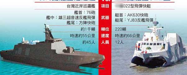 據(jù)不愿透露姓名的臺(tái)當(dāng)局“國防部”主管作戰(zhàn)官員表示,雄三導(dǎo)彈射程三百公里,臺(tái)灣海峽僅兩百至三百公里寬,未來此型近岸巡邏艦只要部署在海峽附近巡弋,即可達(dá)到封鎖臺(tái)灣海峽的戰(zhàn)略嚇阻作用。該艦噸位數(shù)約一千噸,戰(zhàn)時(shí)可在一般漁港進(jìn)行躲避及補(bǔ)給作業(yè),在戰(zhàn)場(chǎng)的生存率上,比拉法葉艦、成功級(jí)艦等大型艦更具優(yōu)勢(shì)。
