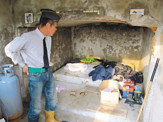 桃園縣黃姓男子窮困潦倒,春節(jié)期間住進(jìn)觀音鄉(xiāng)第一公墓廢棄祖塔,平常穿軍服、戴軍帽打零工。圖片來源:臺灣《聯(lián)合報》