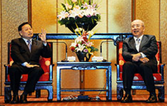吳伯雄會見湖北省委書記羅清泉,表達了對青海震災的關心。圖片來源:臺灣“中央社”